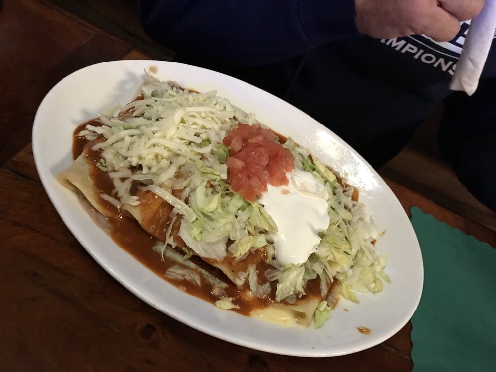 A large flour tortilla filled with your choice of protein, topped with red sauce, lettuce, tomato, and sour cream. Served with Mexican rice and beans.