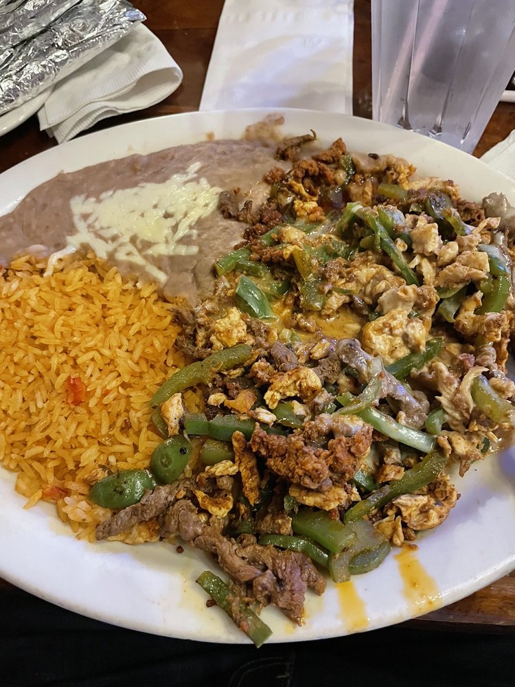 Eggs scrambled with chorizo (Mexican ground sausage) and served with Mexican rice, beans and three tortillas.
