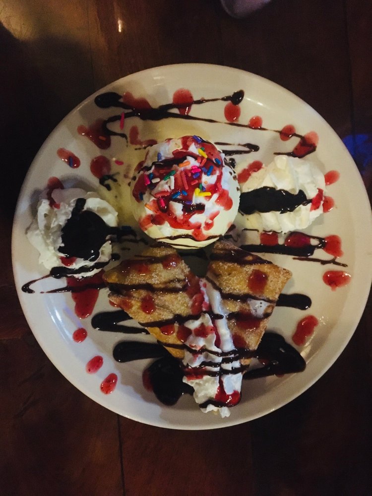 A flour tortilla filled with creamy cheesecake and lightly fried. Topped with whipped cream, strawberry syrup, chocolate syrup and a scoop of ice cream.