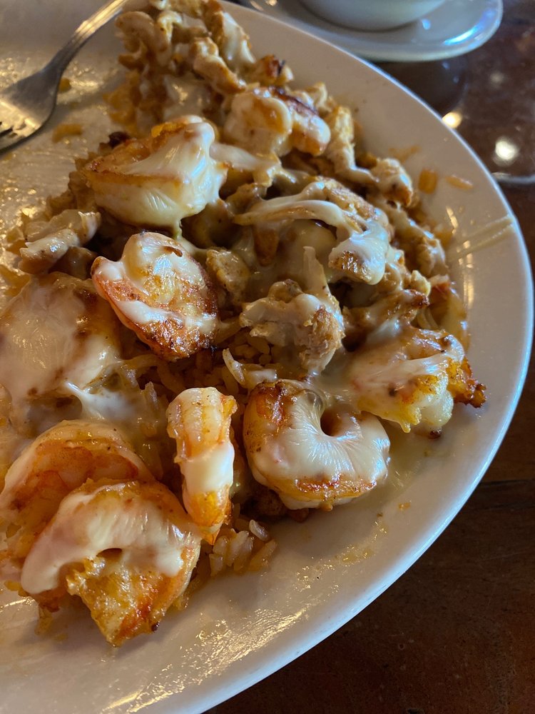 Grilled shrimp placed on top of a bed of Mexican rice, smothered with cheese sauce & served with lettuce, sour cream & tomatoe on the side.